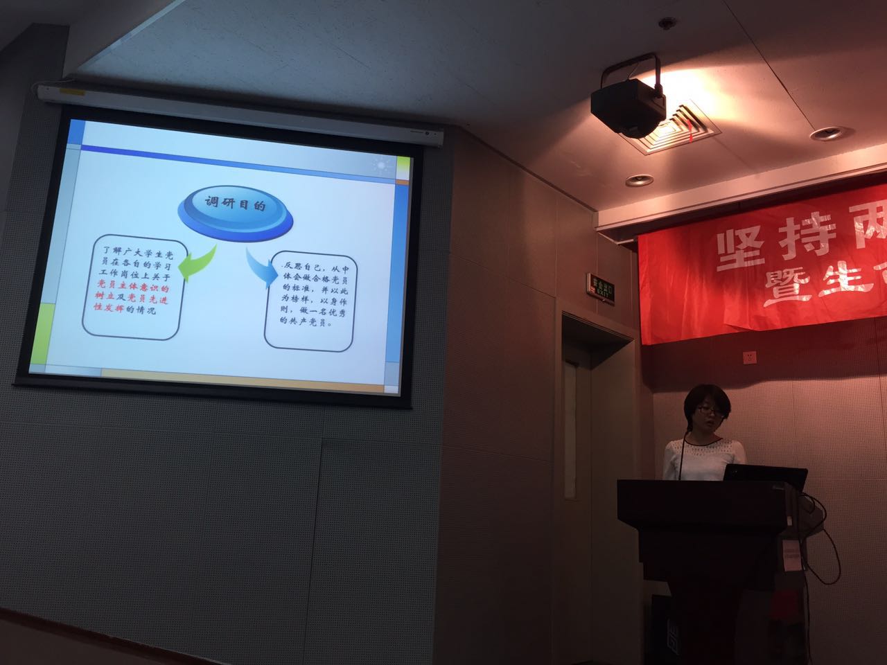 在调研的汇报会上,各个小组的负责人分别用PPT的形式汇报了调研成果,分析了调研中发现的问题,提出了切实可行的解决办法,过程中充分体现了党员同志们的认真思考。如“青年员工对网络舆论的态度”调研组,就针对青年员工对网络文章的关注倾向和网络舆论对员工自身的影响程度,提出了应从四个方面引导网络舆论的正确方向;“理工科员工对实验室安全的重视程度”课题组,结合调研中发现的问题,提出了应加强对硕士接受实验室安全培训的监督,加强对员工自救知识和自救措施的掌握,同时要重视废弃物的处理问题,避免废弃物的污染。