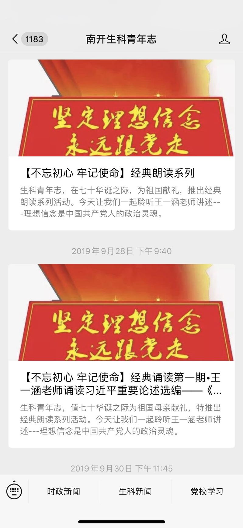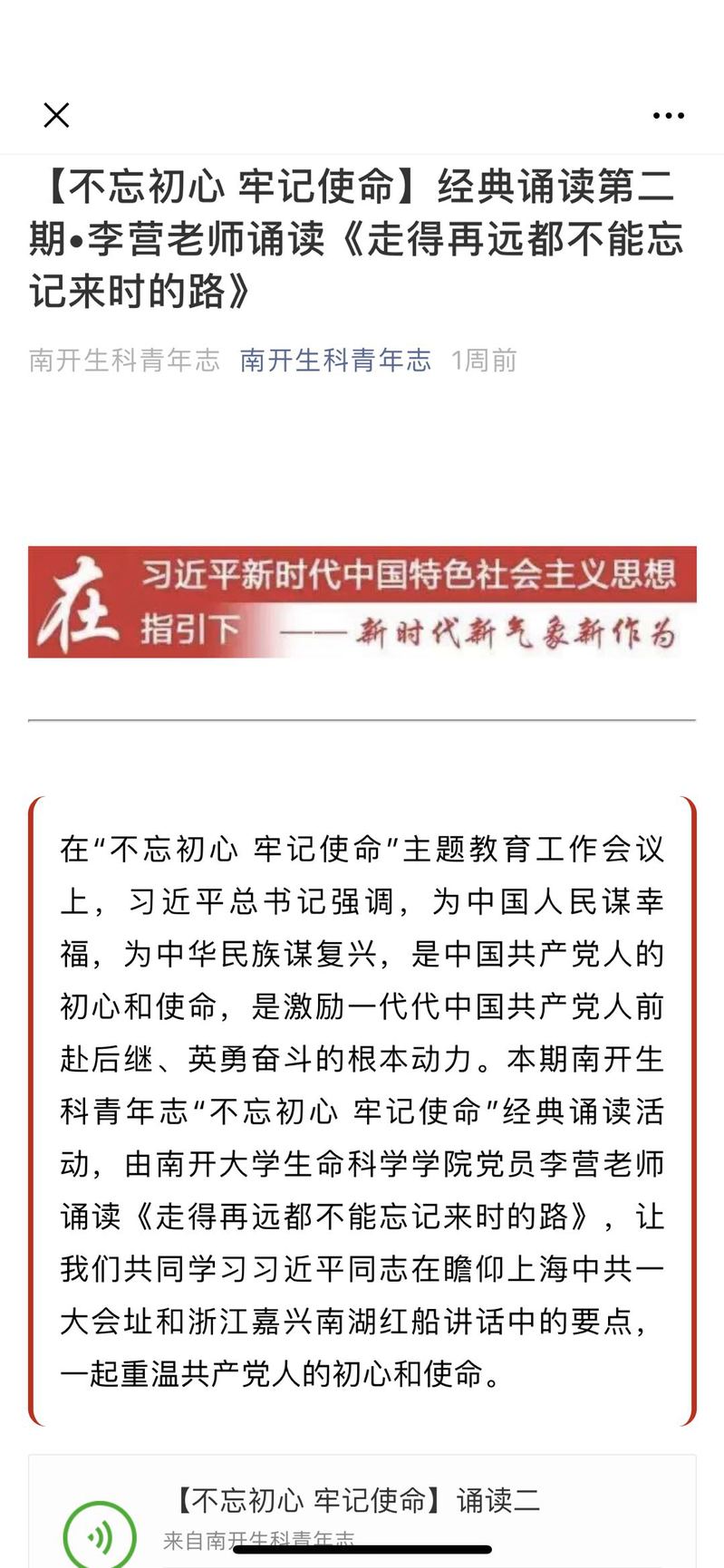 公司党委为全体党员和各党支部书记下发了学习书籍,要求师生党员读原著、学原文、悟原理,围绕高等教育的初心和使命,自觉在学懂弄通上下功夫,提高政治素养和理论水平。为了提高学习效果,创新形式,推出“不忘初心、牢记使命”经典诵读主题活动,在全员师生党员中,征集志愿者30余名,诵读习近平关于“不忘初心、牢记使命”的重要论述,公司党委委员、辅导员、师生党员踊跃参与,诵读的音频定期发布在学院公众号“南开生科青年志”上。