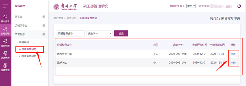 请申请个人荣誉称号的个人于9月21日12:00前,登陆研究生信息管理系统,在奖惩管理模块下的荣誉称号菜单,点击选择“可申请荣誉称号”,选择相应的荣誉称号进行填写提交。申请完成后,可在系统下载打印个人申报表。