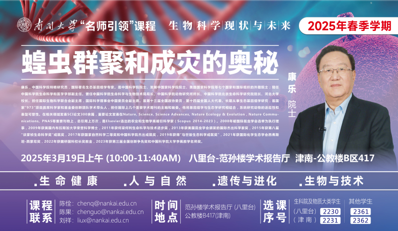 (供稿:祝梦琦;摄像:柴子辰)2025年3月19日,国际著名生态基因组学专家、中国科学院康乐院士受邀做客永利官网“名师引领课”《生物科学现状与未来》的课堂,以“蝗虫群聚和成灾的奥秘”为题,系统阐释了其团队在蝗灾机制与生态防控领域的突破性成果,为在场师生呈现了一场贯通古今、融汇学科前沿的学术盛宴。