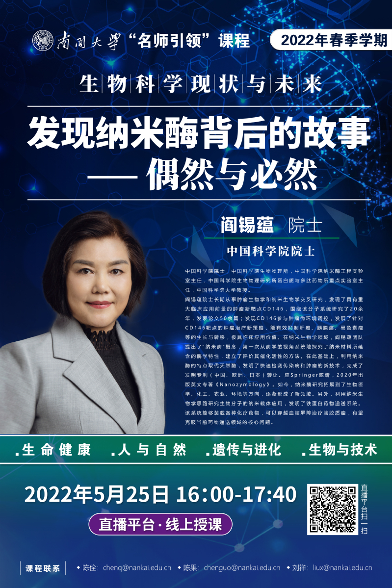 2022年5月25日,中国科学院院士,中国科学院生物物理所、中国科学院纳米酶工程实验室主任,中国科学院生物物理研究所蛋白质与多肽药物所重点实验室主任阎锡蕴教授为我们带来了“名师引领”通识课第十四讲《发现纳米酶背后的故事——偶然与必然》。课程通过腾讯会议与直播平台同步进行,受到了来自永利官网不同学院师生及其他校外人员的热烈欢迎,2500余名师生线上听课。