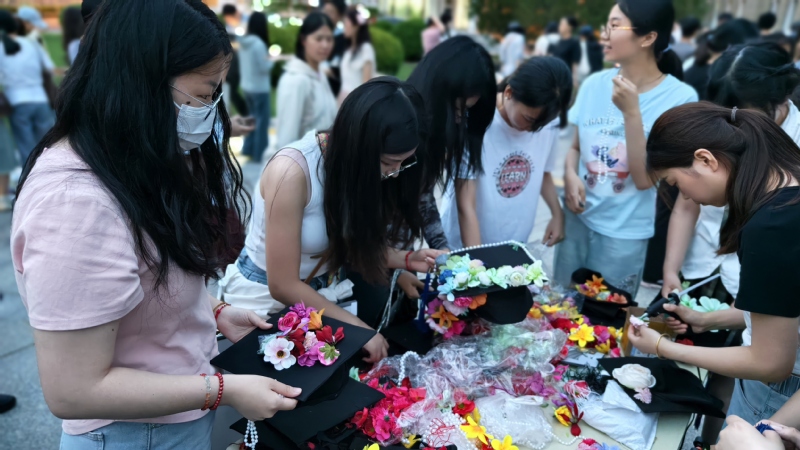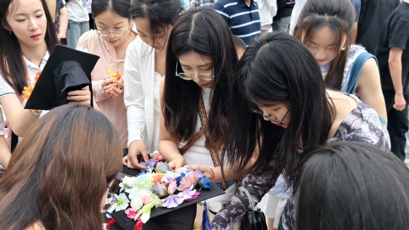 此外,活动现场还设置了毕业小游戏、毕业许愿牌和DIY学位帽等特色环节。猜谜、圈词等小游戏勾起了同学们对四年校园生活的回忆;许愿牌上挂满了同学们对毕业生的祝福与自己的心愿,在灯串的映衬下格外暖心;DIY学位帽摊位前,大家亲手为学位帽簪花装饰,为毕业增添了一份独特的仪式感。
